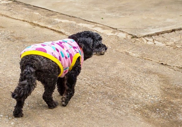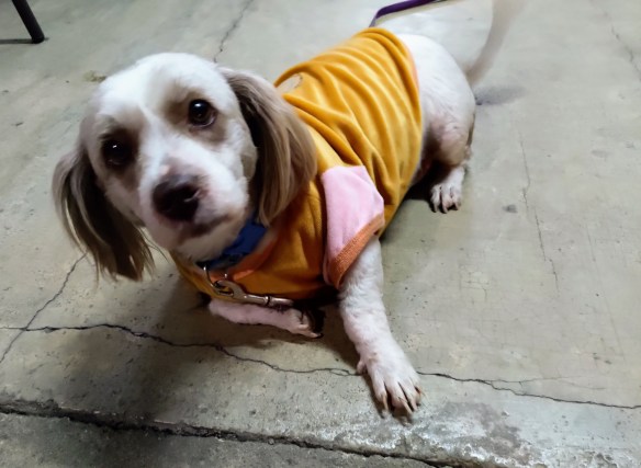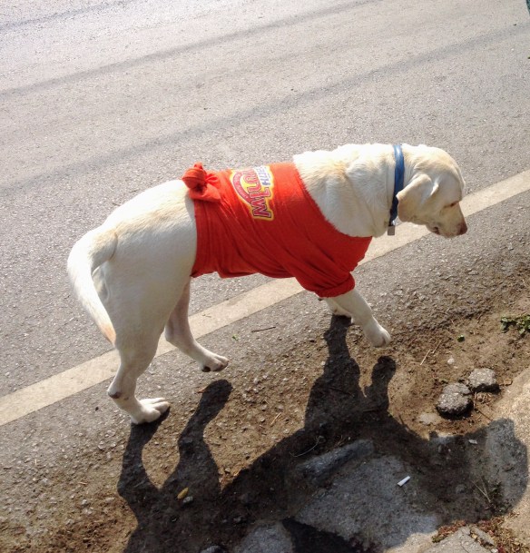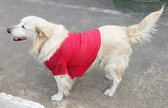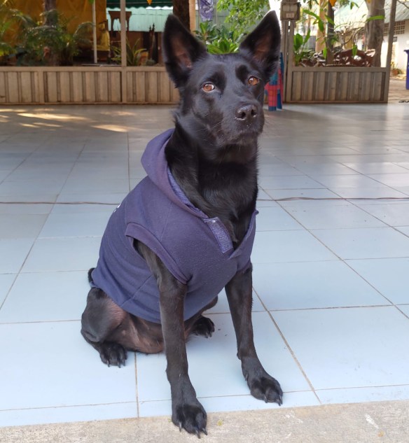 Er zijn heel veel honden in Thailand. s’Ochtends scharrelen ze in groepjes langs de weg. Soms liggen ze lui op het warme asfalt, zich niets aantrekkend van het verkeer. Een enkele hond doet ‘blaf’ en soms volgt er een uitval richting kuiten. Echt gevaar levert het niet op. Een schreeuw en ze weten hun plaats. Dan is er nog een aparte groep honden: tot onze verbazing zien we af en toe ook honden met een shirt aan. Kouwelijk?