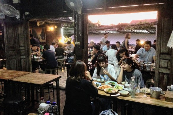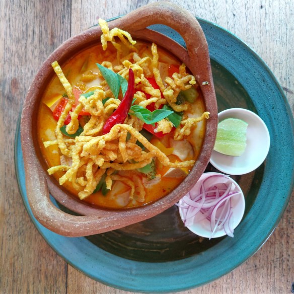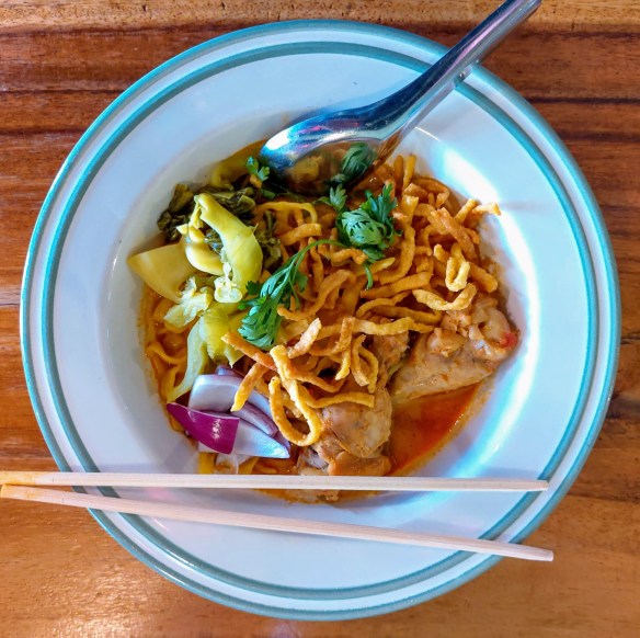 In Chiang Mai en omgeving is Khao Soi een beroemd lunchgerecht. Het is een curry met eiernoodles. Vreemd want het woord Khao betekent rijst, wat zorgt voor verschillende verhalen over de oorsprong van het gerecht. Bijzonder zijn de knapperig gebakken noodles, waarmee de curry wordt afgemaakt. In de curry een kippenpoten of stukjes kip. We aten het meerdere keren. Het is erg lekker.