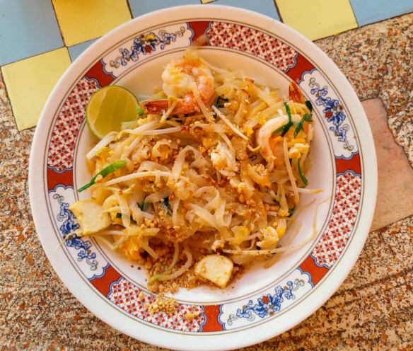 Noedelsoep aten we verschillende keren onderweg in kleine, soms afgelegen, eettentjes waar één gerecht gekookt wordt. In bouillon worden rijstnoedels gegaard, afgemaakt met een paar vleesballetjes, taugé en Thaise basilicum. Extra ‘groen’ mag je er bij nemen. Super lekker. En altijd staat er in zo’n tentje een grote fles drinkwater, waar je zelf een glas uit kunt tappen. IJsklontjes uit de koelbox erbij….