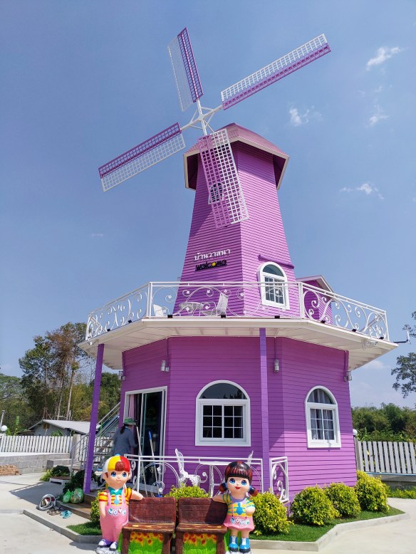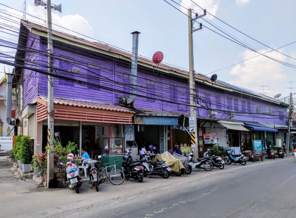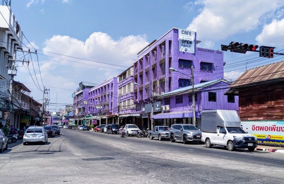 De Thai houden van kleur. We hebben huizen gezien in alle kleuren van de regenboog. Maar de stad Uthai Thani heeft z’n eigen kleur; paars.
