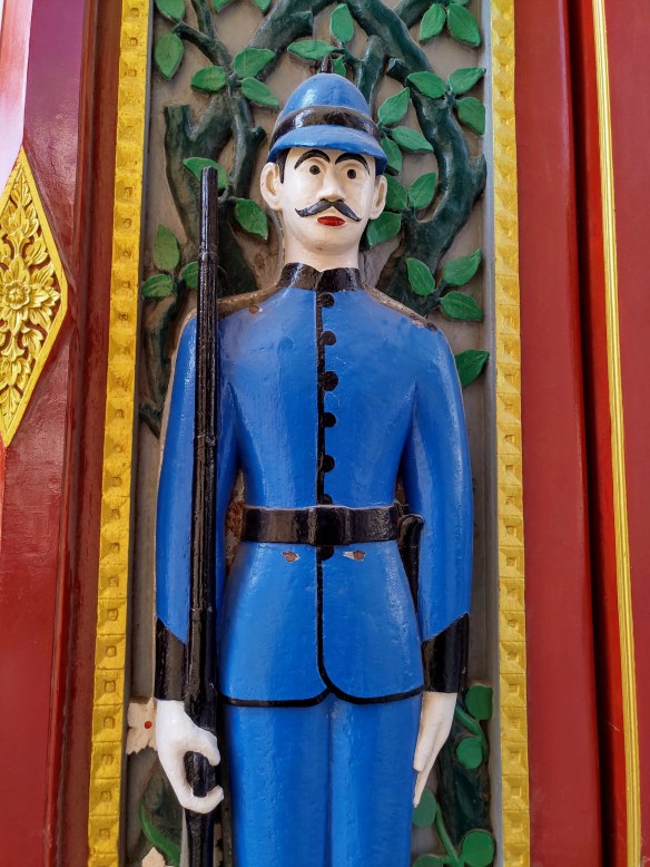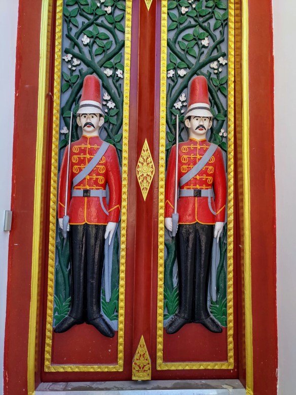 Het inpakken kost wel wat tijd, maar er blijft nog genoeg ruimte om rond te kijken in de stad. Je kunt hier met een gids een fietstocht door de stad maken. Daar zien we maar van af. We laten ons door de tuktuk van het hotel naar de pier aan de rivier brengen. Daar vandaan nemen we, voor omgerekend een dubbeltje, de pont naar Wat Arun. We hebben heel wat Wats bekeken, maar deze is toch weer heel anders van sfeer. Grote chedi’s vol geplakt met stukjes keramiek. Scherven en schoteltjes. Het geheel is prachtig.