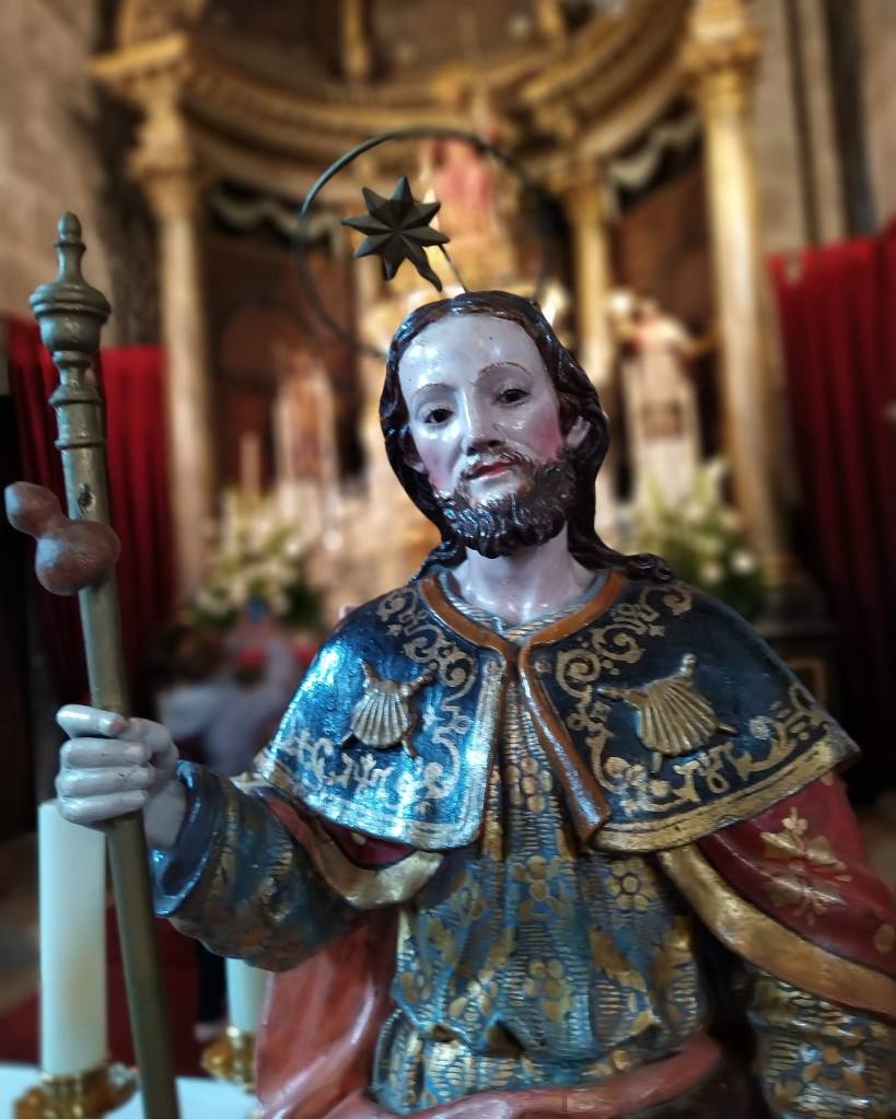 We are still in Santiago for a few hours before we take the bus back to Porto. The weather is nice and we walk again to the main square. I always thought that July 24th is the big holiday, but Sunday the 25th is the official party. It is visible. Part of the large square is closed to the public, with armed police guarding it. The great portal of the church will open for official visits today: once a year. And last night when a lady was vacuuming we got a glimpse of the illuminated interior. The restoration is complete. When we were here two years ago, there was still a lot of building activity in the church. High scaffolding stood around the altar, Now everything looks gleaming.