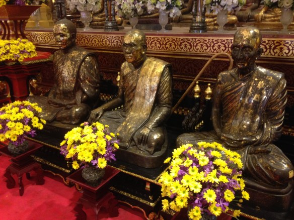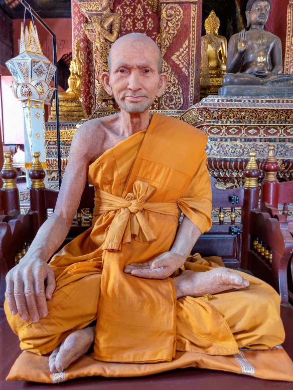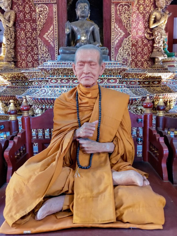 Dat deze monnik-leermeester niet de enige is die levensecht wordt getoond ontdekten we toen we Wat Phra Singh in de oude stad bezochten. Daar zijn nog tien leermeesters vereeuwigd. En omdat deze meesters niet in een vitrine bewaard worden lijken ze nog levensechter. Ze kijken me aan en ik kijk terug.