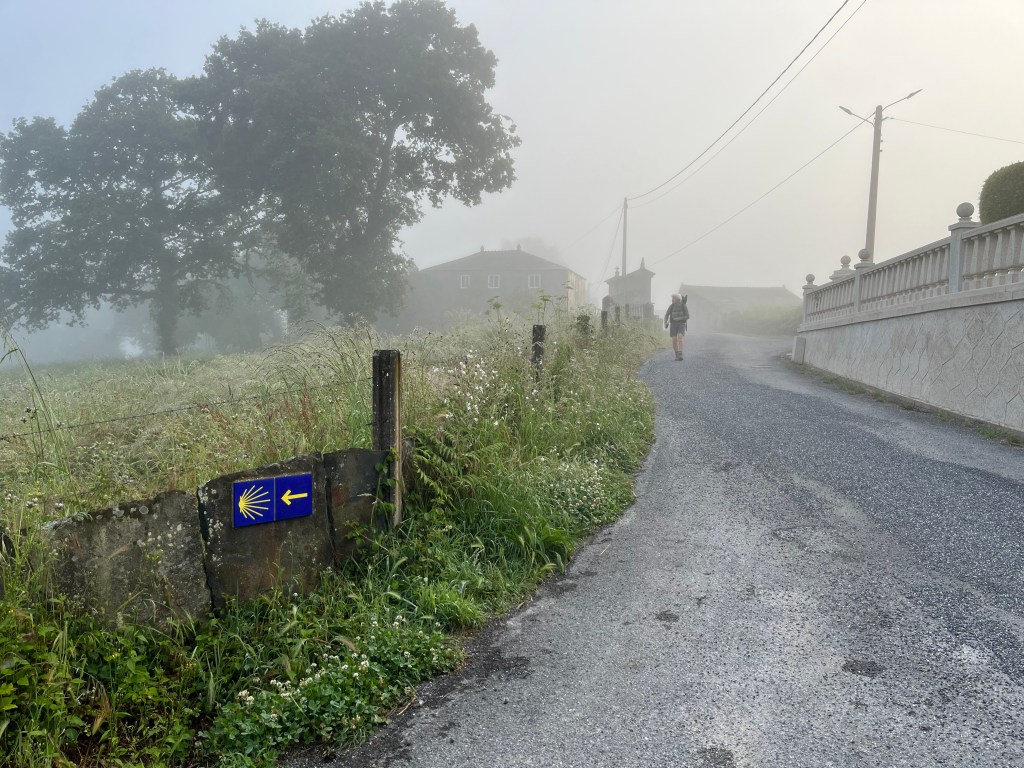 A quick breakfast early in the morning, desayuno. Sometimes a buffet, sometimes coffee and a large slice of cake. And then we’re off, following the yellow arrows. Still cold. The sun just above the horizon. A raking light. An orange glow. Fairytale-like. Low-hanging mist in the valley.