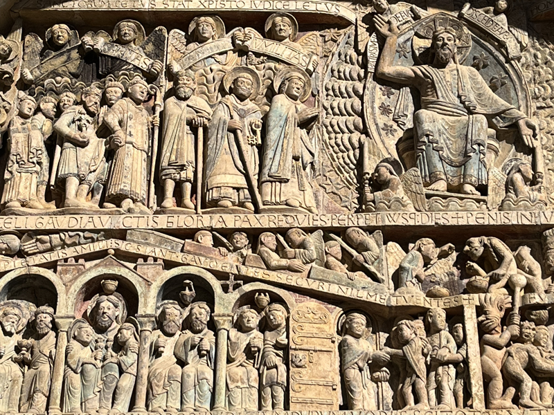 Conques has been frequented by pilgrims on their way to Santiago de Compostela since the 12th century. The large abbey church of Sainte Foy has an impressive tympanum depicting The Last Judgment. Conques is historically an important place on the road to Santiago de Compostela