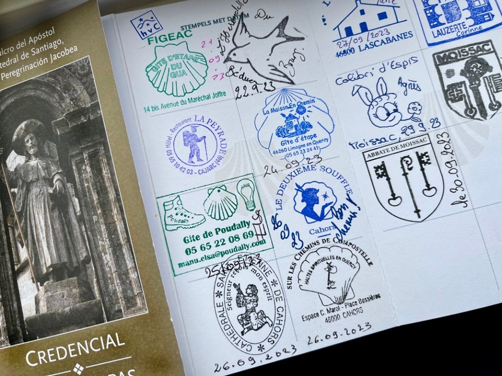 We walked a part of the GR65, the ‘Grande Randonnée 65’ also called the Via Podiensis. A walk in the Midi-Pyrénées. We walked from Le Puy-en-Velay to Conques and on to Moissac. We slept for the first time in ‘Gîtes d’Etapes’. An exciting prospect. It became a wonderful part of the journey. The Gîtes d’Etapes where we stayed overnight are ‘inns’ along the route, where you can sleep if you have a ‘credencial’; the stamp card, in which you can get a stamp in every gîte or cathedral. So this gîtes are really intended for hikers. In the morning around 9 o’clock you have to be on your way again on the next stage.